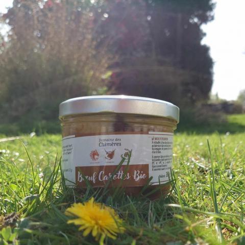 Viande de bœuf des CHIMERES* 50 % minimum, bouillon* (eau, os et couenne* de porc, oignon*, thym*, laurier*), vin blanc*, oignons*, carottes* 5%, pruneaux* 5%, tomates concassées*(tomates, jus de tomate) sel de Guérande, poivre noir*, ail*, coriandre*, thym*, laurier*