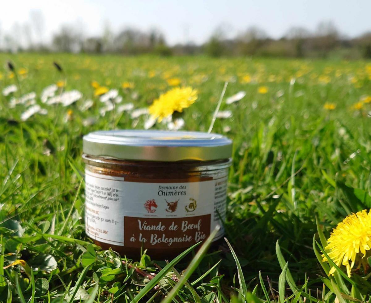 Viande de boeuf* DES CHIMERES 50 % minimum, tomates*concassées (tomates concassées*, jus de tomates*), concentré de tomates*, eau, carottes*, oignons*, beurre* ½ sel (lait), sel de Guérande, sucre de canne*, persil*, ail*, thym*, laurier*, herbes de Provence*, poivre noir*