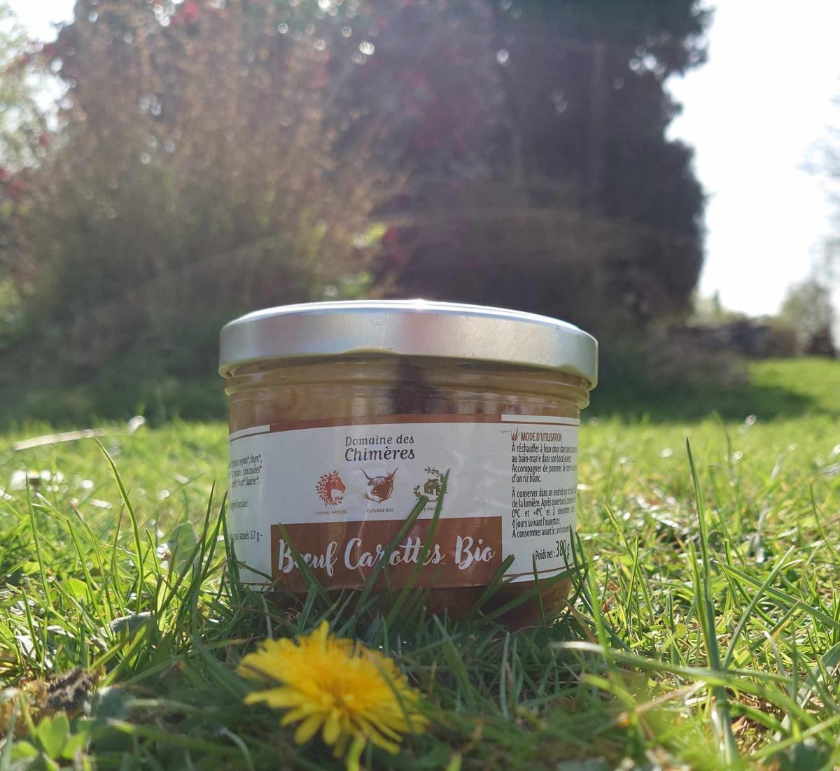 Viande de bœuf des CHIMERES* 50 % minimum, bouillon* (eau, os et couenne* de porc, oignon*, thym*, laurier*), vin blanc*, oignons*, carottes* 5%, pruneaux* 5%, tomates concassées*(tomates, jus de tomate) sel de Guérande, poivre noir*, ail*, coriandre*, thym*, laurier*